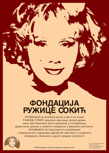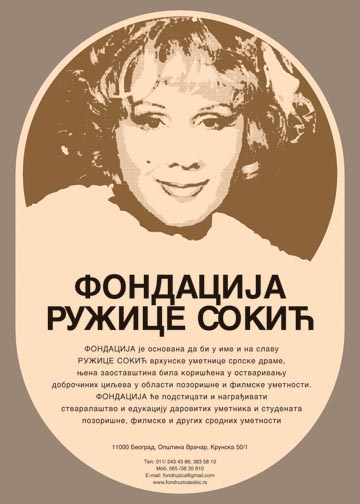 AKTIVNOST FONDACIE ZA POČETAK POZORIŠNE SEZONE Tokom godine, Fondacija je radila na pripremi izložbenog programa manjeg formata koji bi se sprovodio u sklopu pojedinih pozorišnih i filmskih festivala, sa ciljem da se mini-prikaz pod nazivom RUŽICA KAKVU PAMTIMO preko nekoliko panoa da prikaz nekih od značajnih uloga koje je Ružica ostvarila u pozorištu i na filmu, a koje su ostale u lepom pamćenju njenih gledalaca. Prikaz predstavlja portrete likova koji su obeležili filmsku i televizijsku karijeru Ružice Sokić. U pitanju je odabir 10 najautentičnijih i najprepoznatljivijih glumačkih karaktera, koji su ostali u sećanjima kod šireg auditorijuma. Među deset portreta našli su se oni čije citate pamte generacije – poput gospođe Veliborke iz Srećnih ljudi, Duške iz filma Kad budem mrtav i beo, Mire iz filma Užička republika, Perside iz serije Tesna koža, pa sve do tetka Taske iz filma Zona Zamfirova. Izložba je zamišljena kao putujući program koji će se realizovati u sklopu različitih pozorišnih i filmskih festivala. Cilj ove izložbe jeste da objedini bogat opus i sintetički prikažu transformacije i kreacije u jednoj bogatoj glumačkoj karijeri. Jedna od najvećih vrlina koju je Ružica zasigurno imala jeste mogućnost tumačenja uloga širokog spectra, od zavodnice do žene iz naroda, od aristokratskih i likova , do onih koje se označavaju kao" žene sa dna" .Uloge ovog poslednjeg tipa naročito je volela i vrlo uspešno ih ostvarivala, Prvo predstavljanje, predviđeno je da se u Pozorištu SLAVIJA u vreme otvaranja "Nušićevih dana".