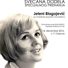 U novembru 2016. godine, Upravni odbor Fondacije je doneo odluku da se za pozorišnu sezonu 2015/2016 godinu ne dodeli glavna godišnja nagrada RUŽICA SOKIĆ, ali je shodno svojim statutarnim ciljevima, kao i savremenim tendencijama da se talentovani mladi učenici i studenti ističu i nagrađuju, odlučeno da se u 2016. godini dodeli Specijalno priznanje za doprinos omladinskom pozorišnom stvaralaštvu, pa je u tom cilju uručeno specijalno priznanje mladoj članici Omladinskog pozorišta DADOV Jeleni Blagojević, rođenoj 2002. godine, koja je do sada igrala u preko 180 pozorišnih predstava sa našim eminentnim glumcima, kako u Ateljeu 212, tako i u Narodnom pozorištu.